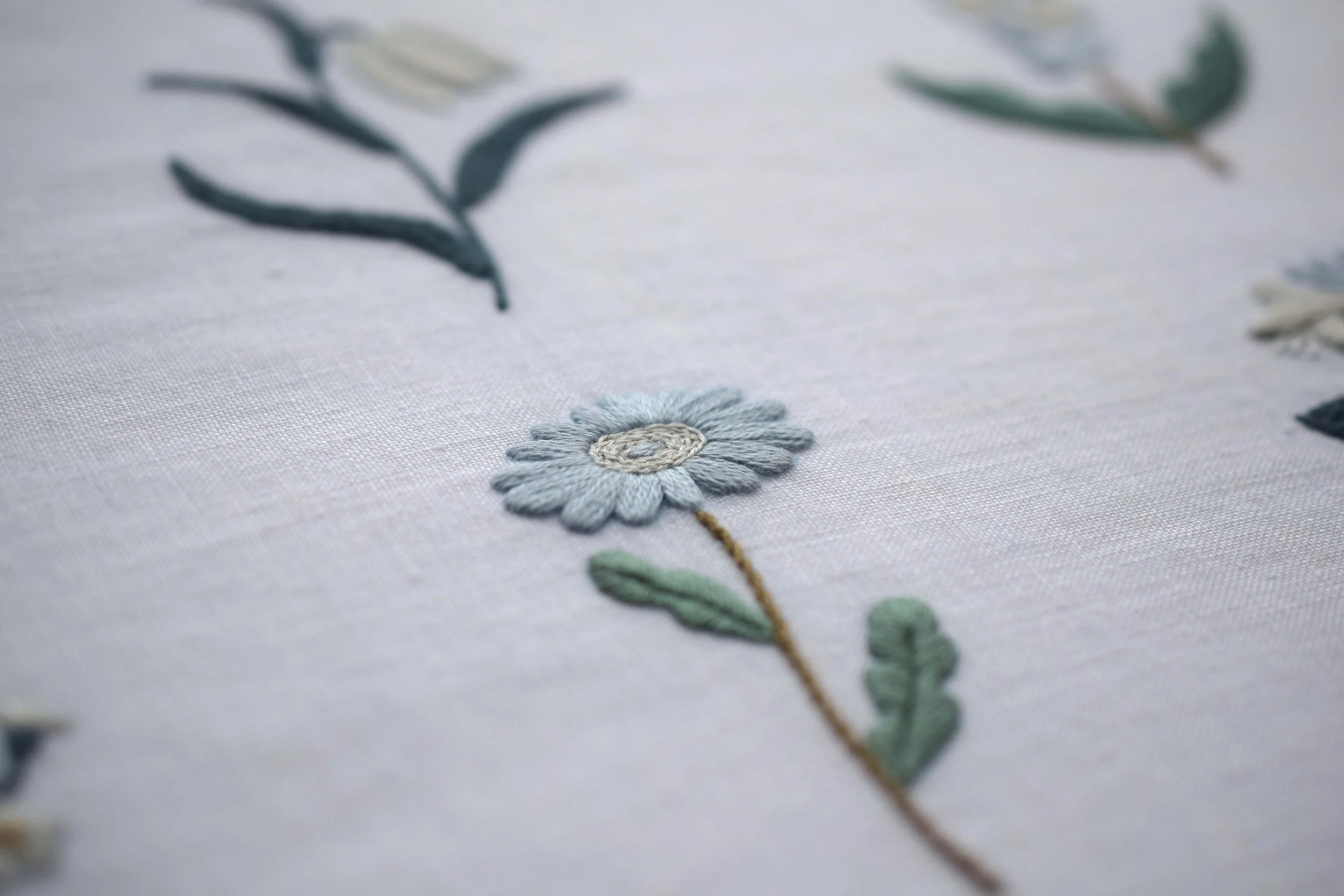 作品の生地には、上質なベルギーリネンを使用。布目が細かいのでサテンステッチのお花など繊細な表現が刺しやすくなっています。
