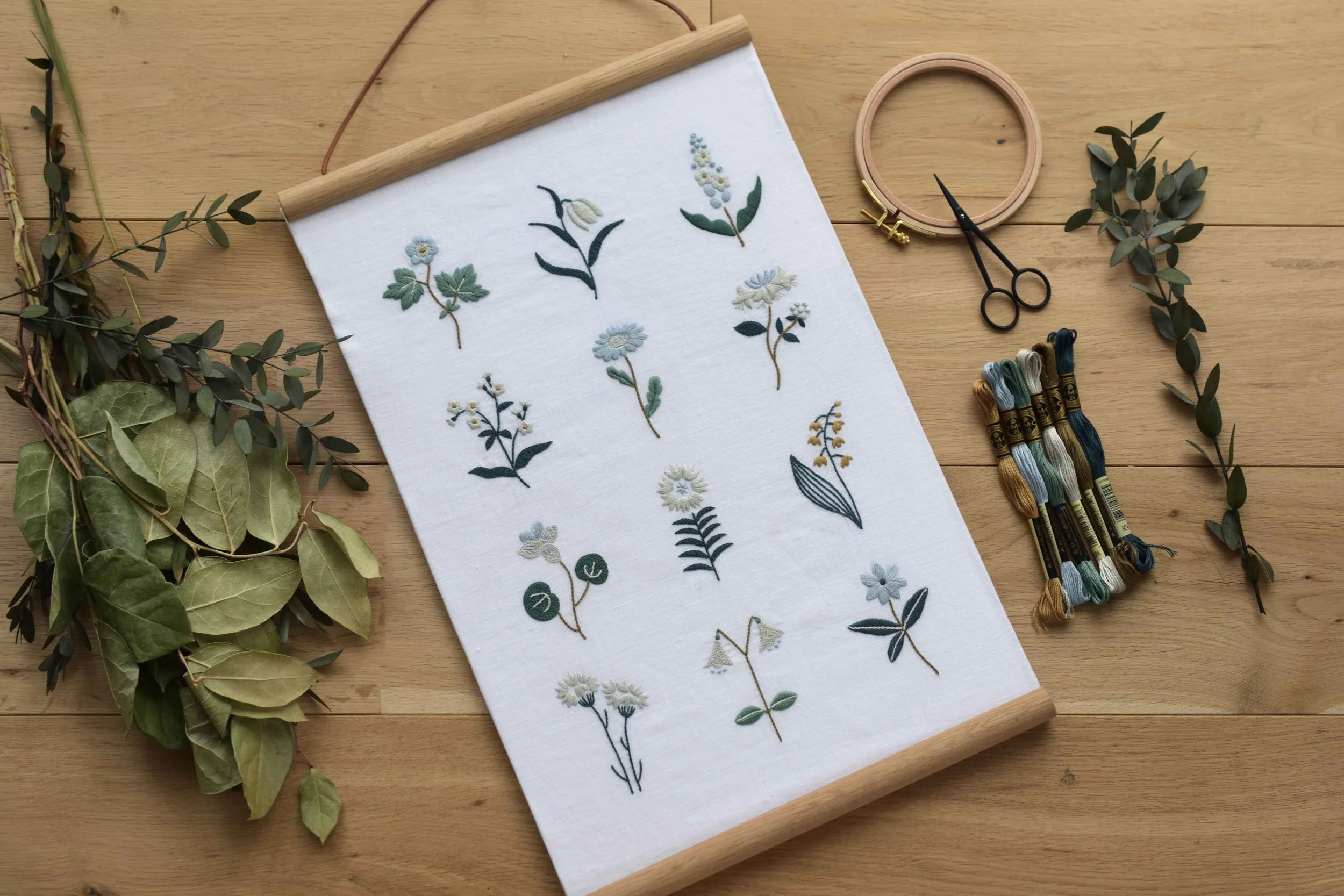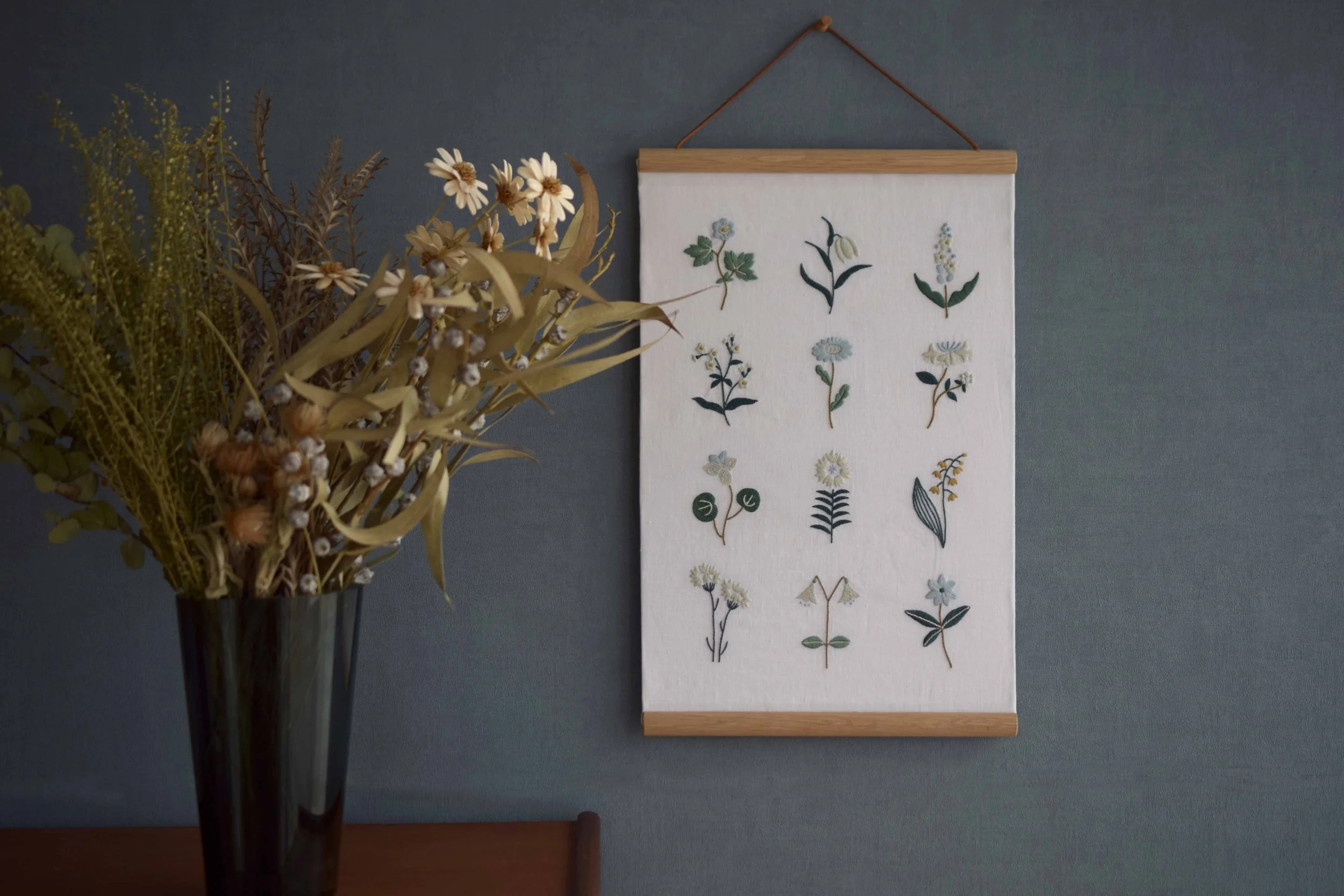 草花のモチーフを刺繍しながらお部屋に飾れるタペストリーづくりができる刺しゅうキットです。